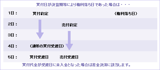 買付日が決算期等により権利落ち日であった場合権利落ち日取引の受渡日は通常より1営業日多い5営業日目に行われますので、翌営業日に当該銘柄を売却すると双方の取引の受渡日は同日となります。この場合やはり買付代金の全額入金がなければ差金決済取引となります。 |